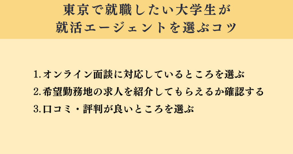 ここでは、東京で就職したい大学生が就活エージェントを選ぶコツを紹介します。