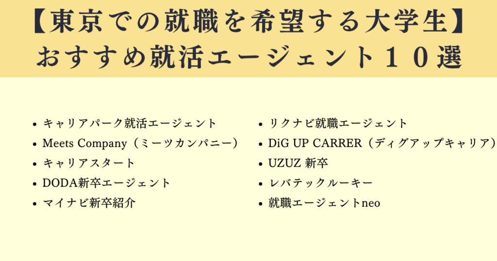 そこで本記事では、東京で就職したい大学生におすすめの就活エージェントを10個紹介します。